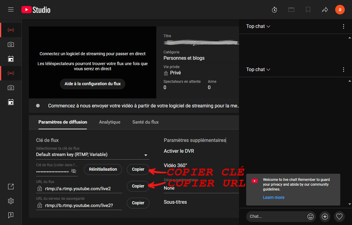 3. Récupérez les informations RTMP :
