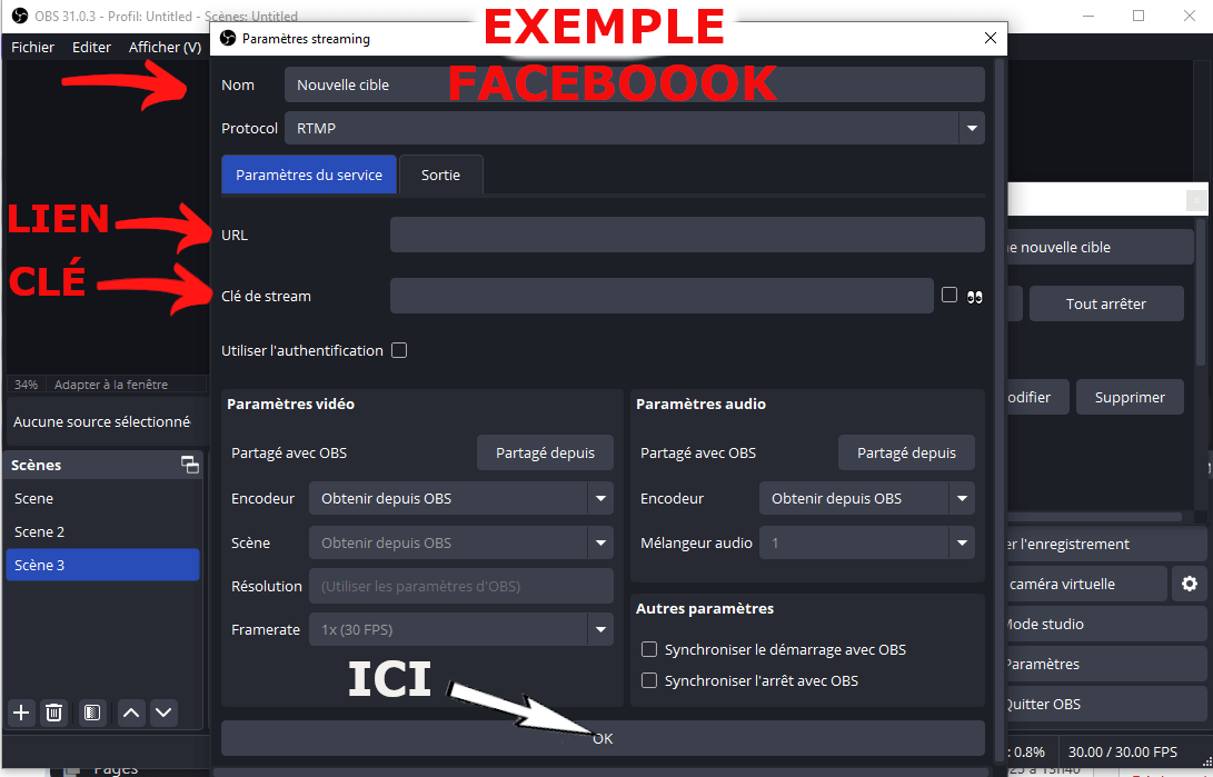 Cliquer sur ajouter une nouvelle cible pour saisir votre clé et lien (URL) du réseau social sur OBS.